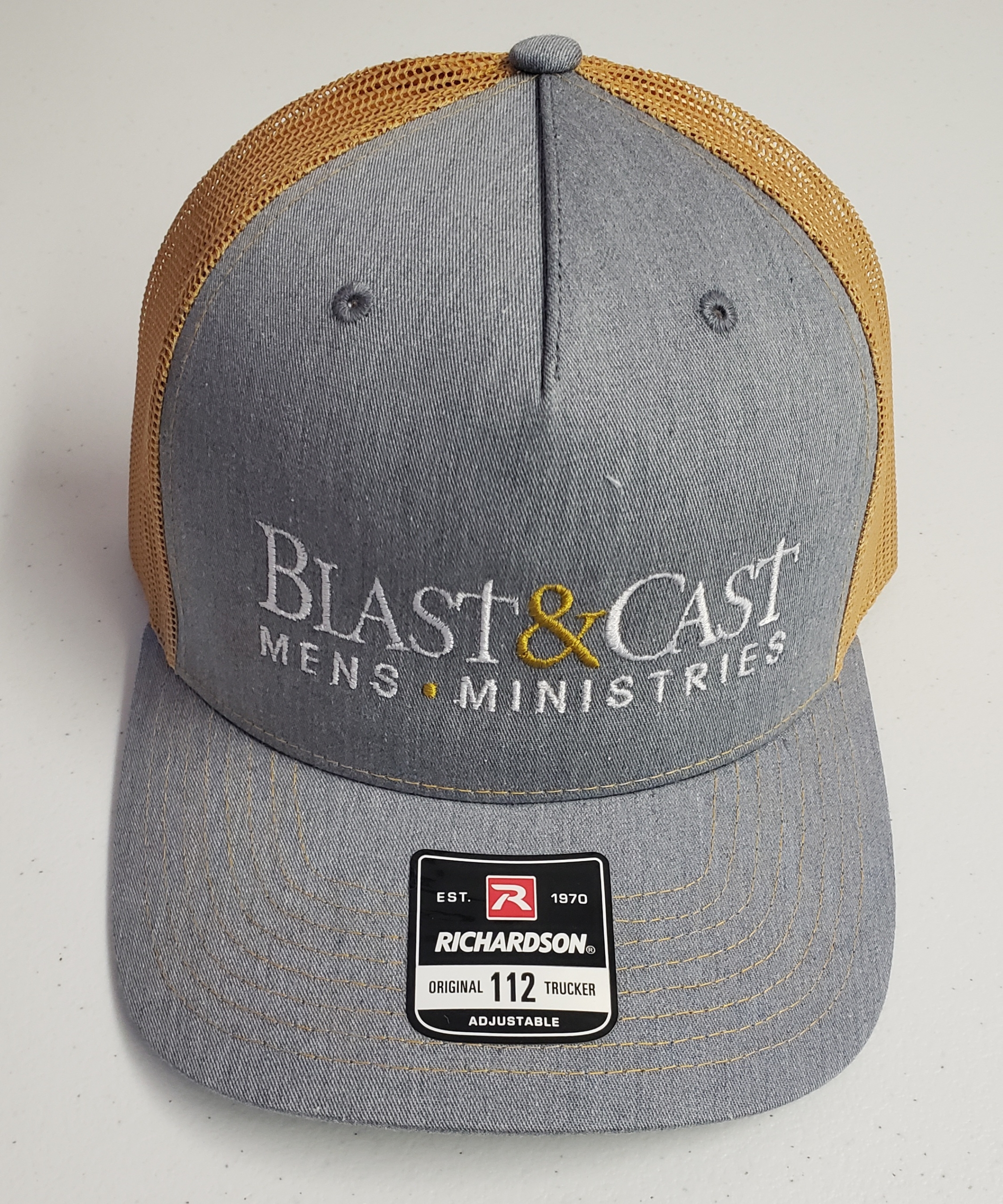 Richardson 112 model hat with embroidered logo. Light gray front with a gold/mustard mesh back. Snap back.