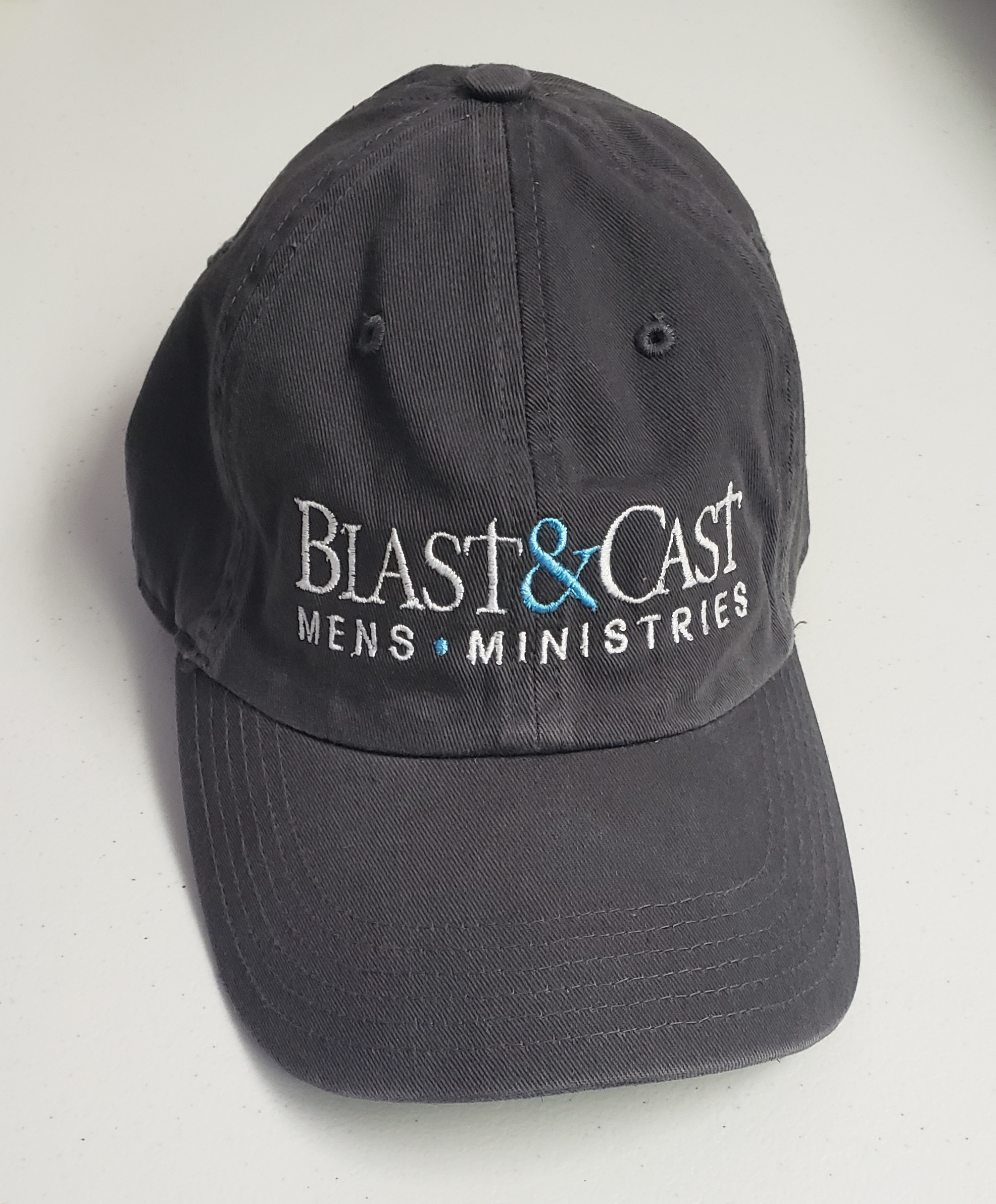 Unstructured Richardson model hat. Charcoal gray with a white logo and light blue accent. Adjustable cloth strap with a metal buckle.