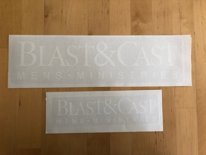 White logo stickers with clear background – Small (2.5″x9″) and Large (4″x15″).